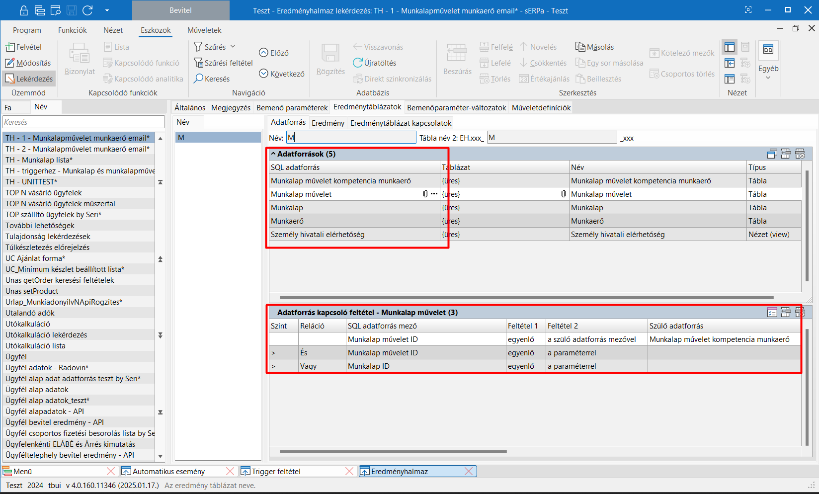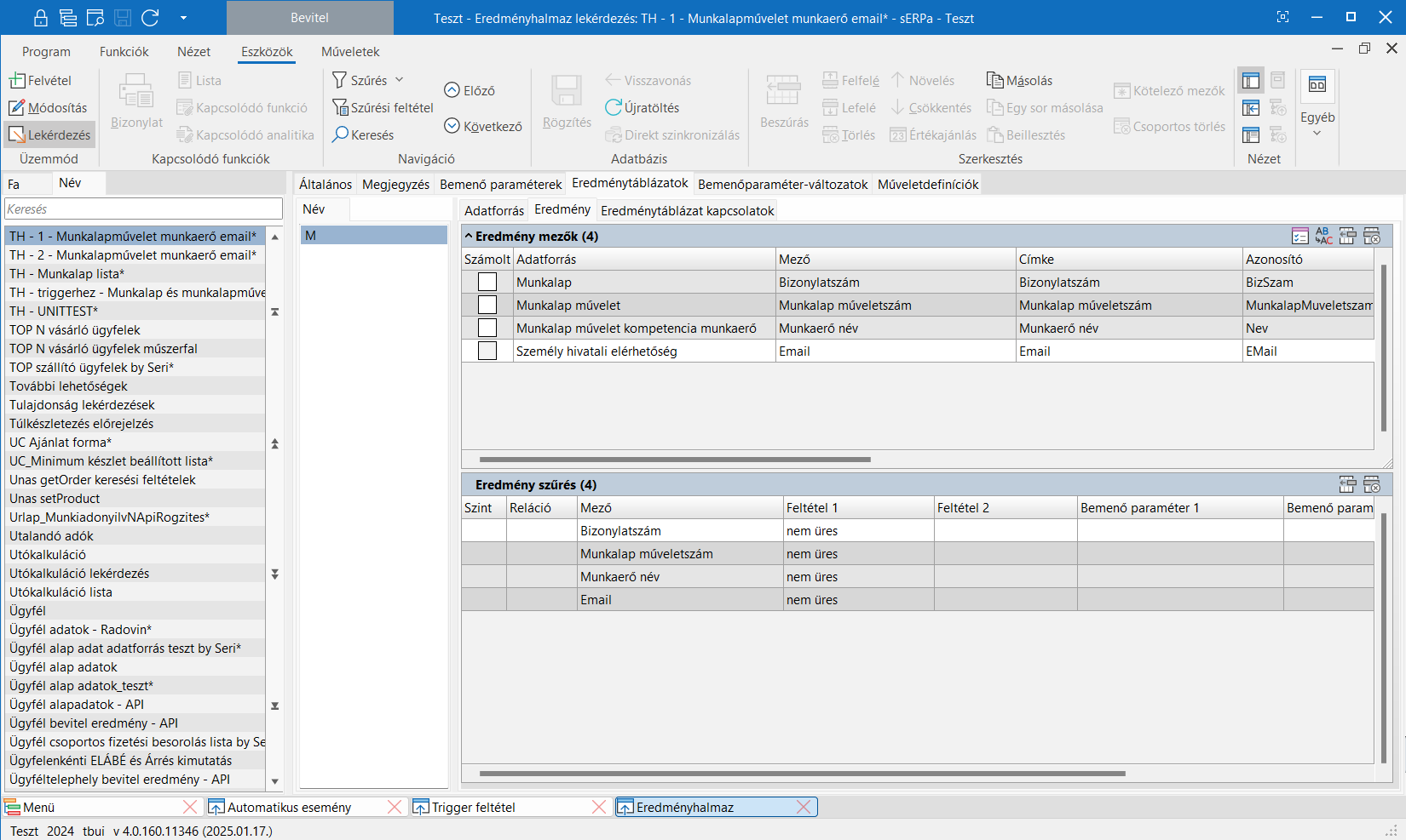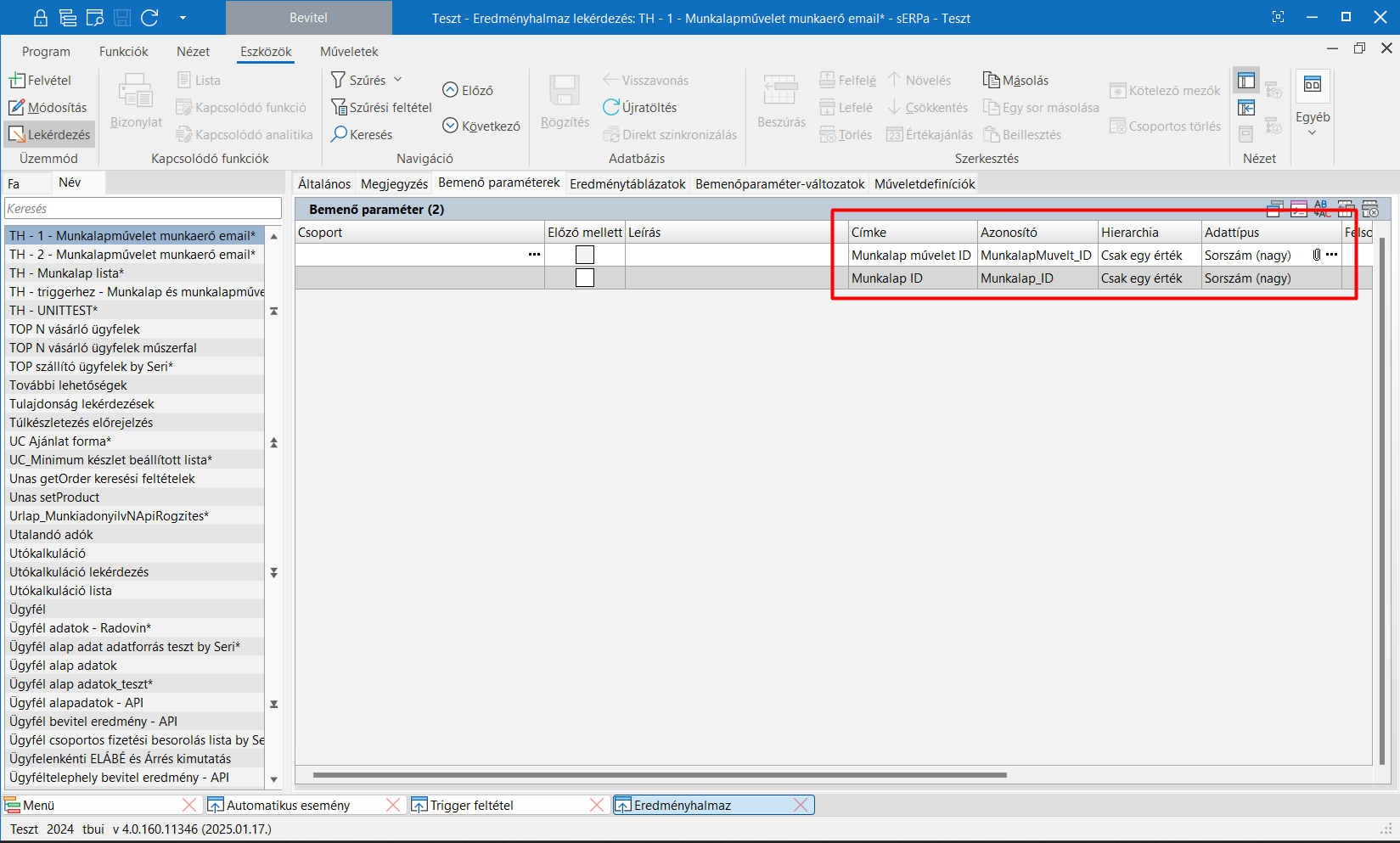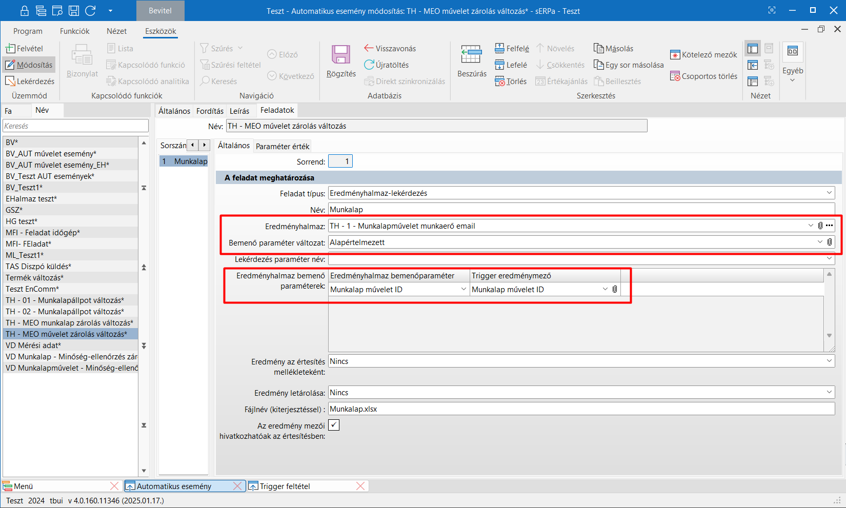 - Eredményhalmaz bemenő paraméterekben a munkalapművelet bemenőt kössük össze a trigger munkalapművelet eredmény mezővel.