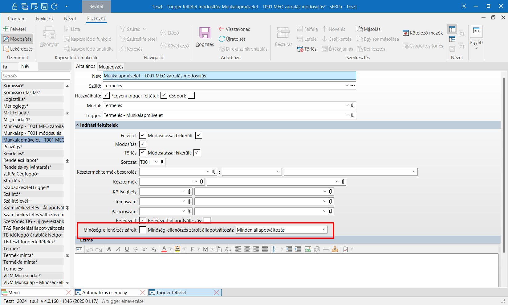 - Minőség-ellenőrzés zárolt mező legyen üres (vegyük ki a ?-t), ez biztosítja, hogy ha egy nem zárolt művelet zárolás állapota változik, akkor aktivizálódik