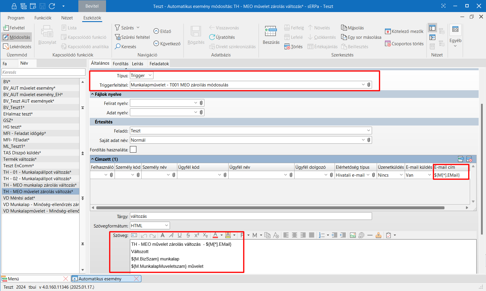 - E-mail címbe meg makrózzuk be a tábla és mező nevet (kis és nagybetűre nagyon figyeljünk): ${Munkaero[*].EMail}