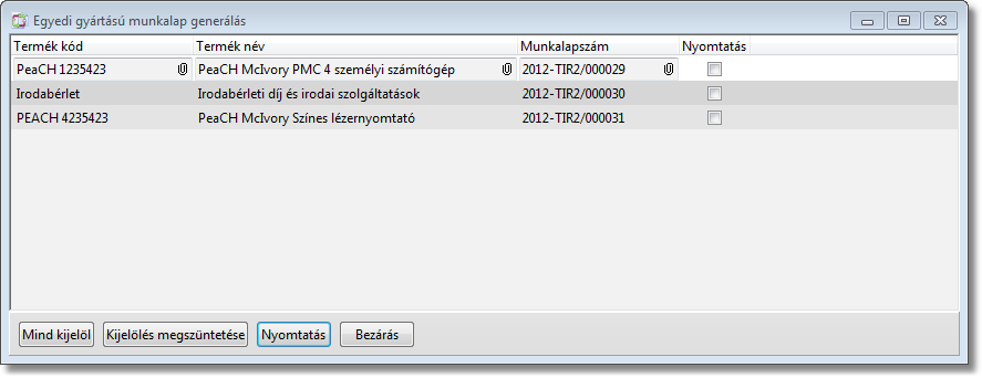 A szűrési feltételek megadása után egy előkészítő panelon kipipálhatjuk, hogy melyik munkalapok készüljenek, és a végén az elkészült munkalapok az eredmény panelon megjelennek, ahonnan lehetőség van több darab kinyomtatására.