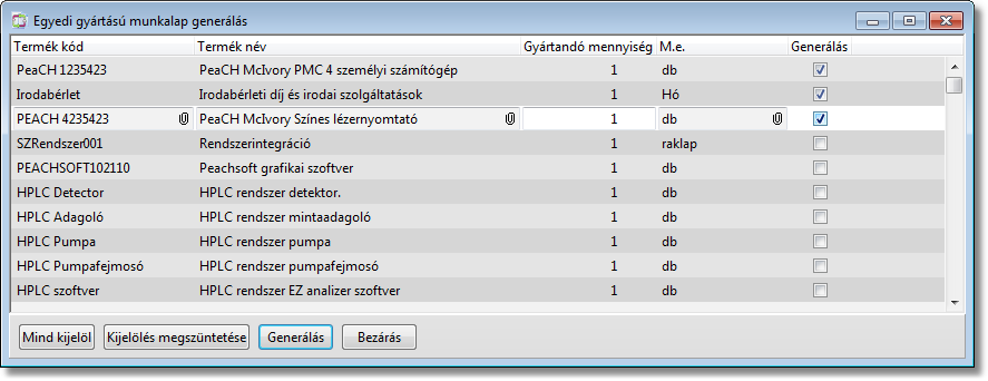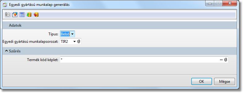 A funkcióval generálhatunk külső egyedi gyártású munkalapokat vevőrendelésekből vagy vagy belső munkalapokat termékekből kódképlet alapján.