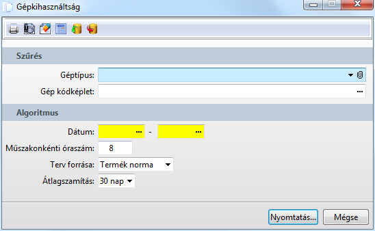 Funkció elérése menüszerkesztéskor: Termelésirányítás / Termelés gépkihasználtsági lista