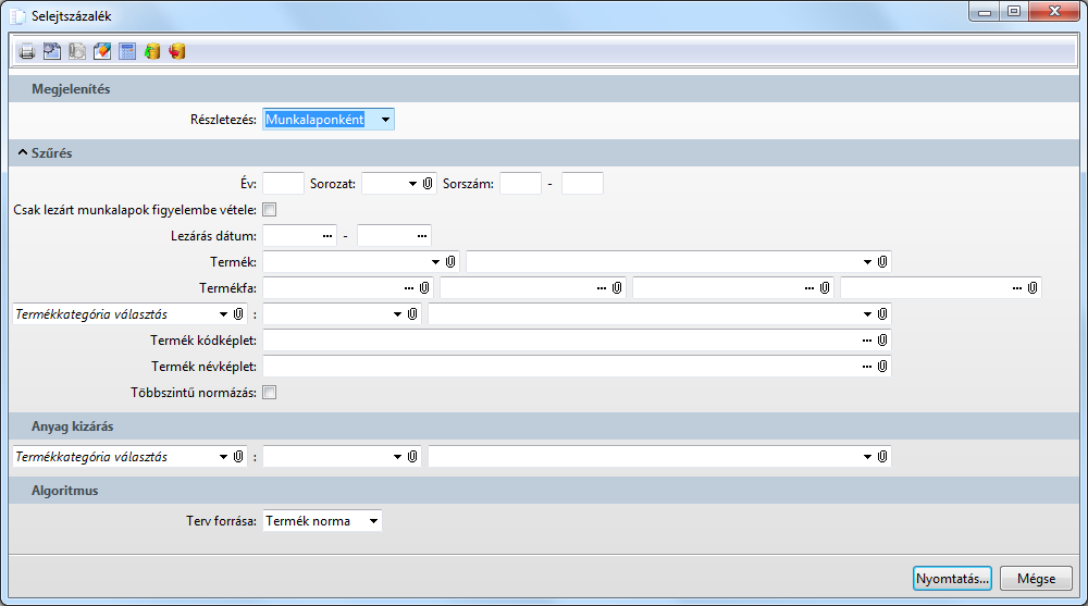 A funkció a megadott szűrési feltételeknek megfelelően kimutatja a termelés során keletkezett anyagselejtet (terv - a legyártott késztermék mennyiség alapján - és tény anyagkiadások közötti különbség).