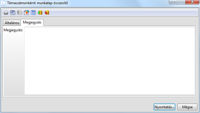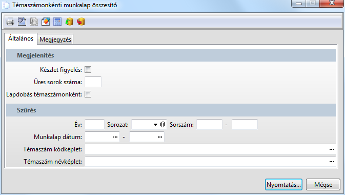 Funkció elérése menüszerkesztéskor: Termelésirányítás / Témaszámonkénti munkalap összesítő lista