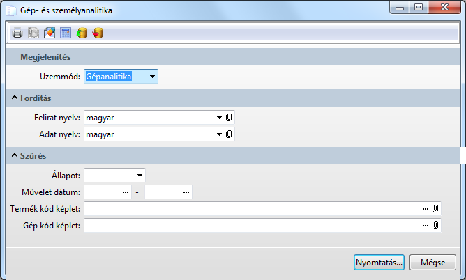 Funkció elérése menüszerkesztéskor: Termelésirányítás / Gép- és személyanalitika lista