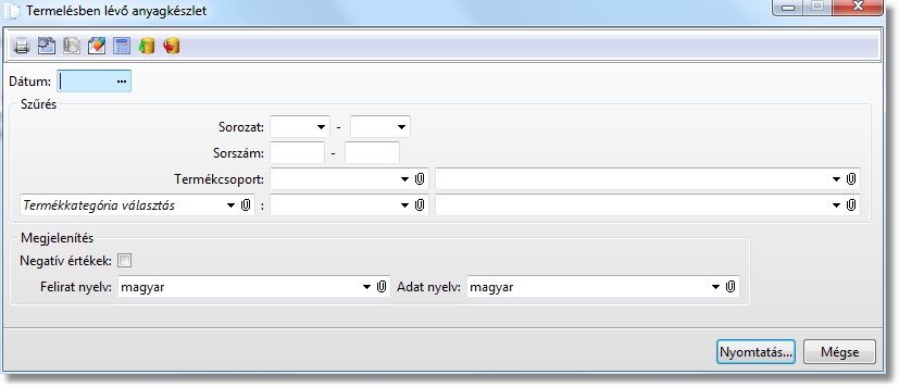 Funkció elérése menüszerkesztéskor: Termelésirányítás / Termelésben lévő anyagkészlet