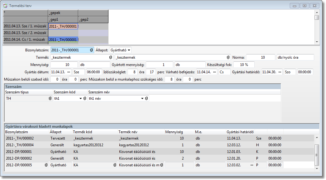 Az eredményképernyő első táblázatának sorai a dátumokat és a hozzájuk tartozó műszakokat tartalmazzák, az oszlopok pedig a párbeszédablakban kiválasztott géptípusokat.