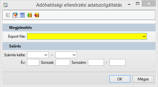 A Szűrés részben az adatszolgáltatásra vonatkozó feltételeket adhatjuk meg. A számla kelte mezőkben nem kötelező, de célszerű kitölteni a kezdő és záró dátumot. Ez az adatszolgáltatás intervallumának kezdő és záró tartománya. Az Év mezőben tudjuk meghatározni, hogy mely évben előállított számlákra vonatkozzon az adatszolgáltatás. Kitöltése szintén opcionális, ahogy a számla sorozatra és sorszámra vonatkozó szűrés is. Amennyiben nem adjuk meg ezeket az adatokat, akkor az összes évre, az összes sorozatú és összes sorszámú számla legenerálásra kerül. Akkor célszerű megadni az évet, sorozatot és sorszámot, ha NAV revizort csak egy adott év, adott számlasorozata érdekli, vagy egyéb okból daraboltan szeretnénk átadni az adatállományt. Pl. Export számlák.