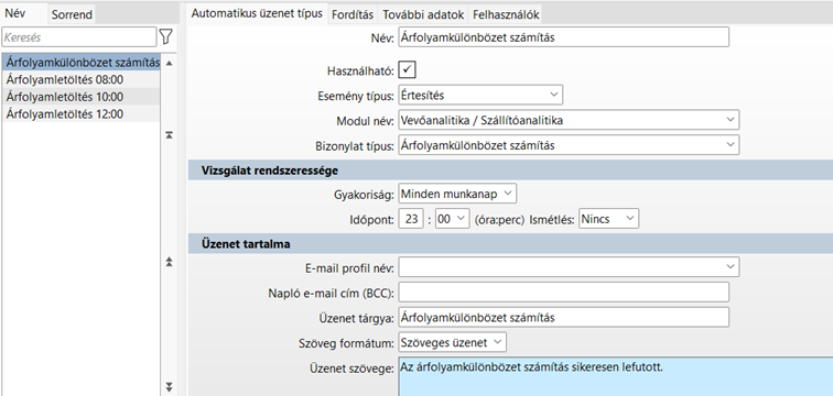 Az árfolyamkülönbözet számítást a Rendszerfunkciók / Üzenetküldés, E-mail / Automatikus üzenet típus funkcióban kell beállítani az alábbiak szerint: