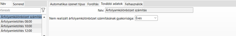 A mérlegfordulónapi külföldi fizetőeszközben fennálló kötelezettség, illetve követelés átértékelése, azaz a nem realizált árfolyamkülönbözet számolása az automatikus üzenet típusnál beállított Árfolyamkülönbözet számítás AUT További adatok fülén beállított gyakorisággal történik.