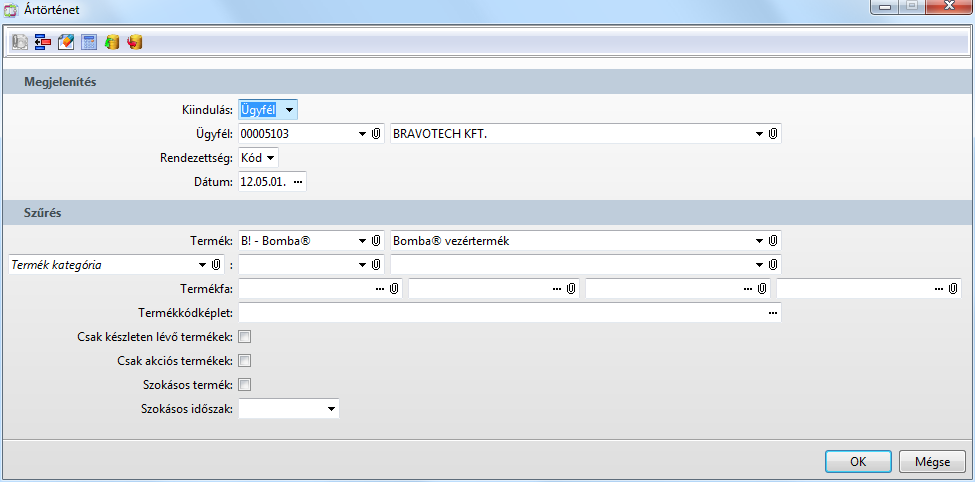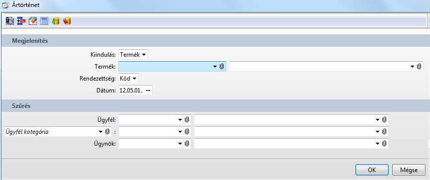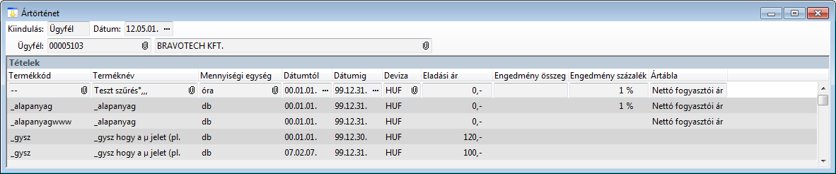 Egy termékhez vagy ügyfélhez rögzített Eladási ár történet képernyőn történő lekérdezése szolgál a funkció. Vevő ár, vevő engedmény, és akciós ár funkciókban van lehetőség dátumtartomány megadásával termék eladási árat és engedményt rögzíteni.