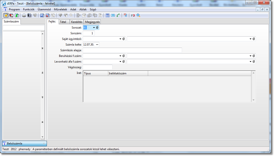 A funkció feladata belsőszámlák bevitele, kontírozása, és nyomtatásának indítása.