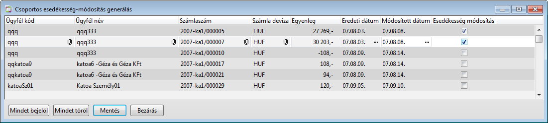 A funkcióban először a párbeszédpanelen megadhatunk szűréseket, ezt követően a megjelenő eredményképernyőn beállíthatjuk, hogy melyik számlát mely dátumra módosítsa a program.