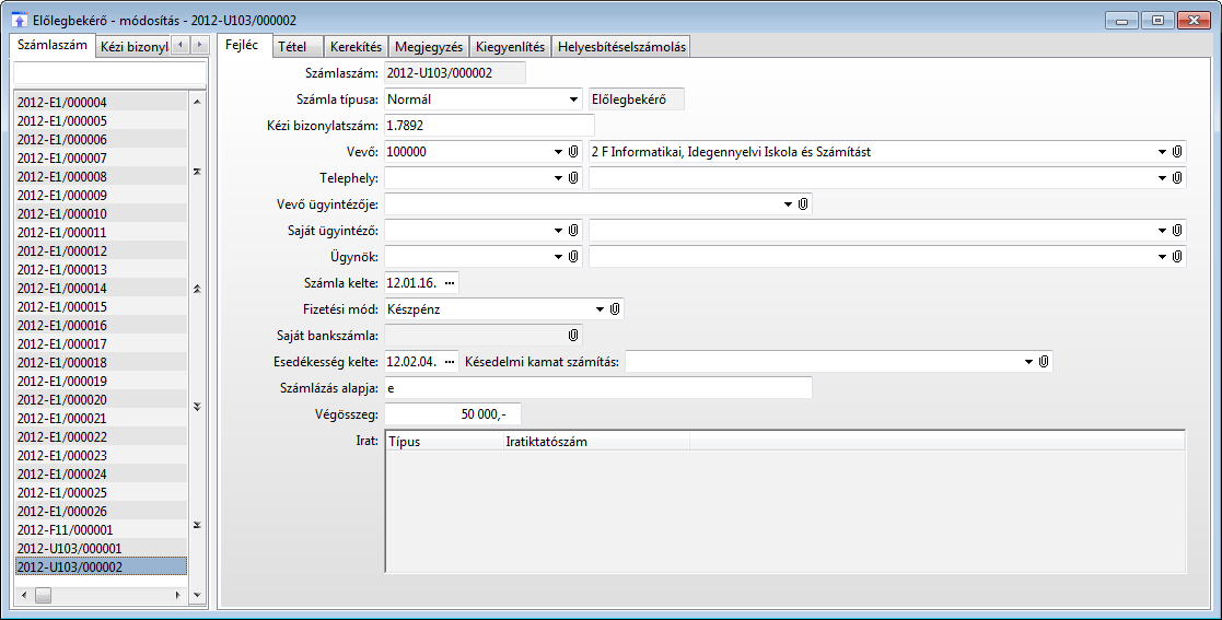 2. A pénzváltás az alapértelmezett árfolyam pénzintézet (főkönyv/pénzügy paraméter) árfolyamaival történik, deviza vételivel, a teljesítés dátumával. Ha nincs aznapra árfolyam, figyelmeztet a program. Ez a művelet mentéskor történik, felvétel üzemmódban nem látszik az átváltás fül. A számításoknál figyelembe kell venni az áfa kategóriára és a számla végösszegére vonatkozó kerekítési szabályokat. Az áfa kerekítést + eltérést a kategórián belül legnagyobb számlatétel áfájához, a számla végösszeg kerekítést + eltérést a számlán belül legnagyobb tétel nettó értékéhez kell mentéskor hozzáadni. Lásd ElolegBLezaras tárolt eljárás.
