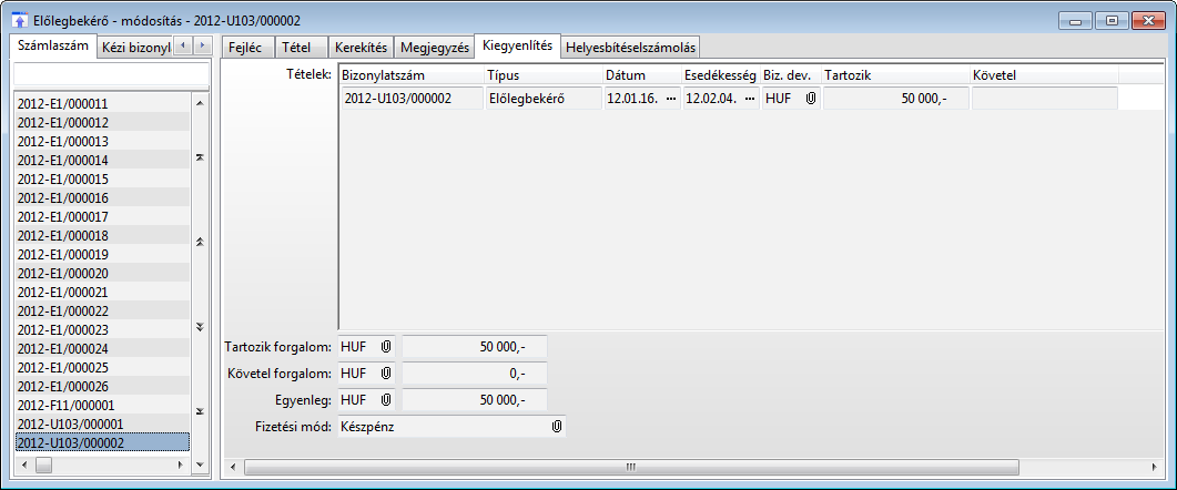A fül csak módosítás és lekérdezés üzemmódban jelenik meg. A táblázatban megjelenik az előlegbekérő, valamint a hozzá kapcsolt banki vagy pénztári kiegyenlítések. Az összegek az előlegbekérő devizanemében jelennek meg.