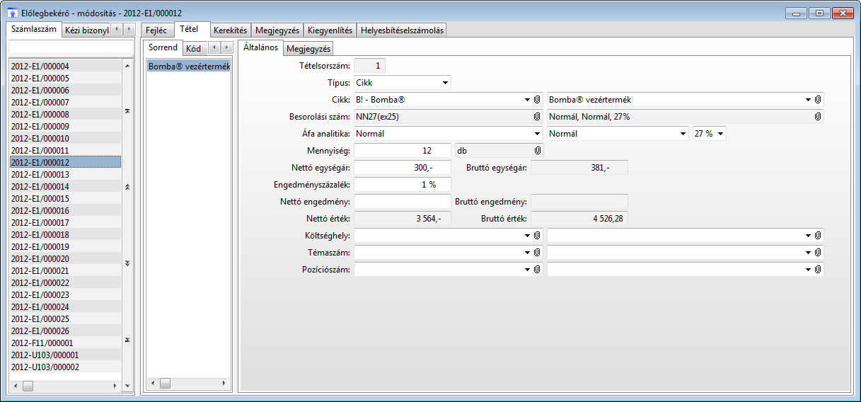 Navigáció: Pénzügy > Vevő > Funkciók > Előlegbekérő