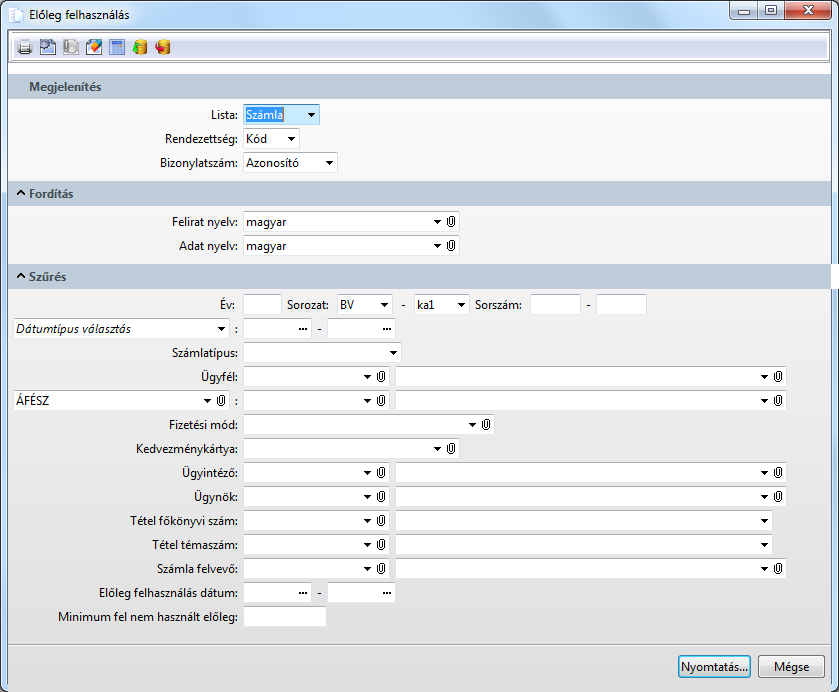 A funkció segítségével a számlázott előlegeket és a hozzájuk tartozó előleg felhasználásokat listázhatjuk.