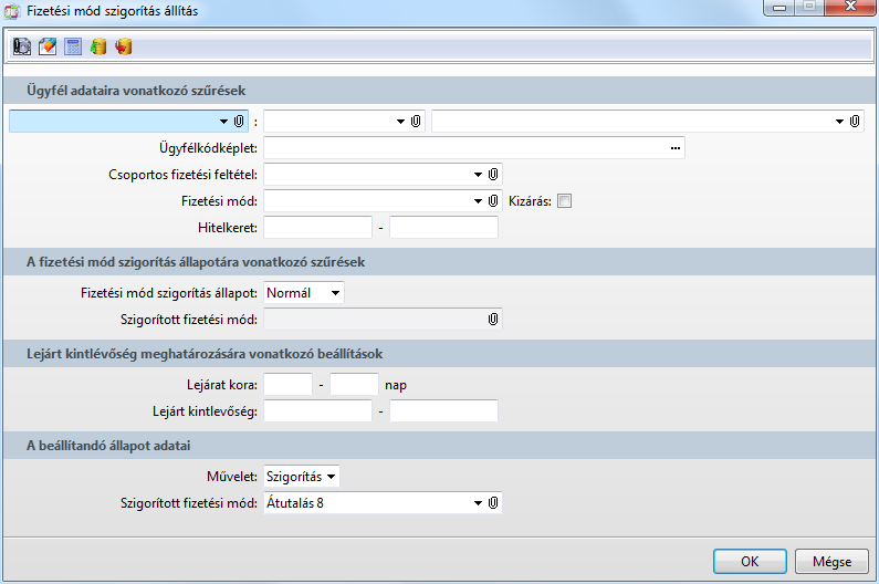 A funkció elindítása után megjelenő ablakban meg kell határozni azoknak az ügyfeleknek a körét, akikre vonatkozóan a fizetési mód szigorítást végre kell hajtani. Érdemes körültekintően megválasztani a szűrési feltételt, mert a leválogatás időigényes lehet.