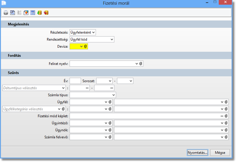 Funkció elérése menüszerkesztéskor: Vevőanalitika / Szállítóanalitika / Fizetési morál lista
