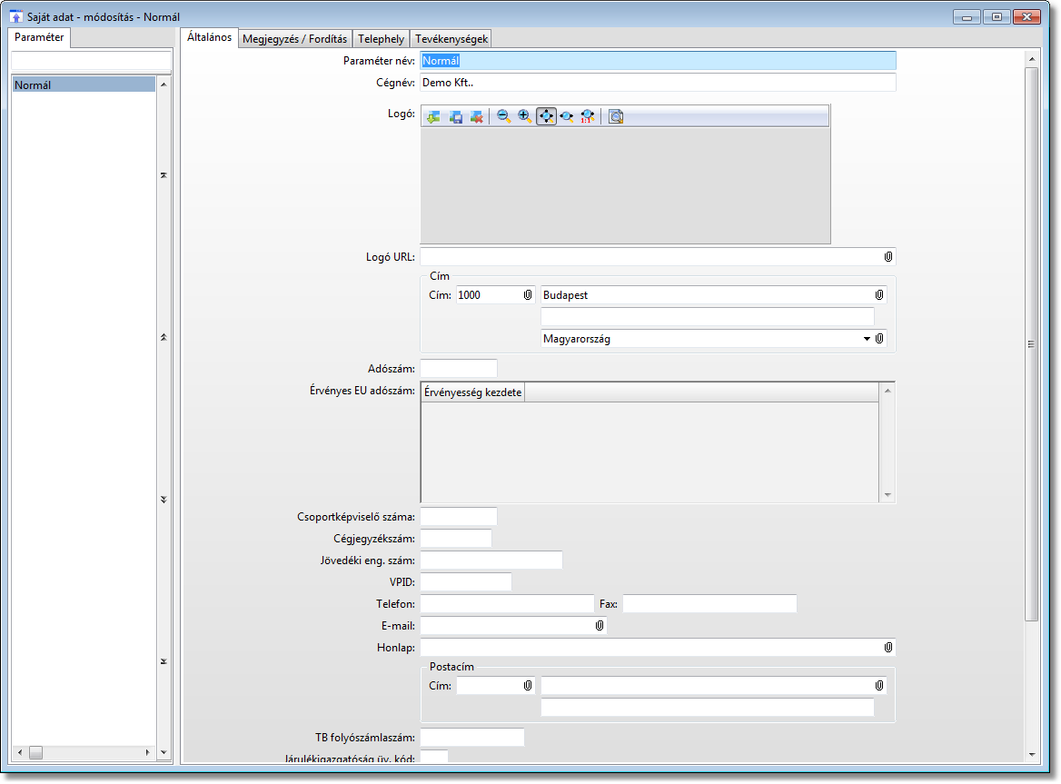 A modulok struktúrájában lévő paraméterben, például Vevő\Struktúra\Vevőszámla-paraméter a saját adatot, illetve a telephelyet át kell írni, az új adatokat tartalmazóra.