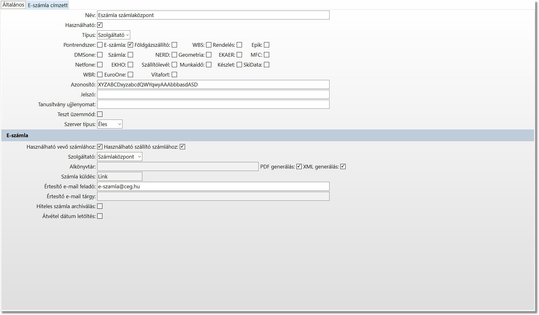 Pipáljuk be a PDF és XML generálás jelölőnégyzetet. XML generálás: ESzigno Szolgáltató esetén, ha a mező értéke igaz, akkor nyomtatáskor legeneráljuk az Számla XML-t, melyet a vevőszámla számlakép fül táblájába mentünk el.