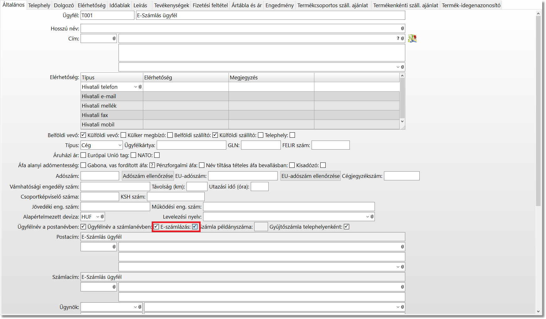 Majd az Ügyfél funkcióban lehet meghatározni, hogy mely ügyfelünknek állíthatunk ki e-számlát. (Általános fül / E-számlázás mező)
