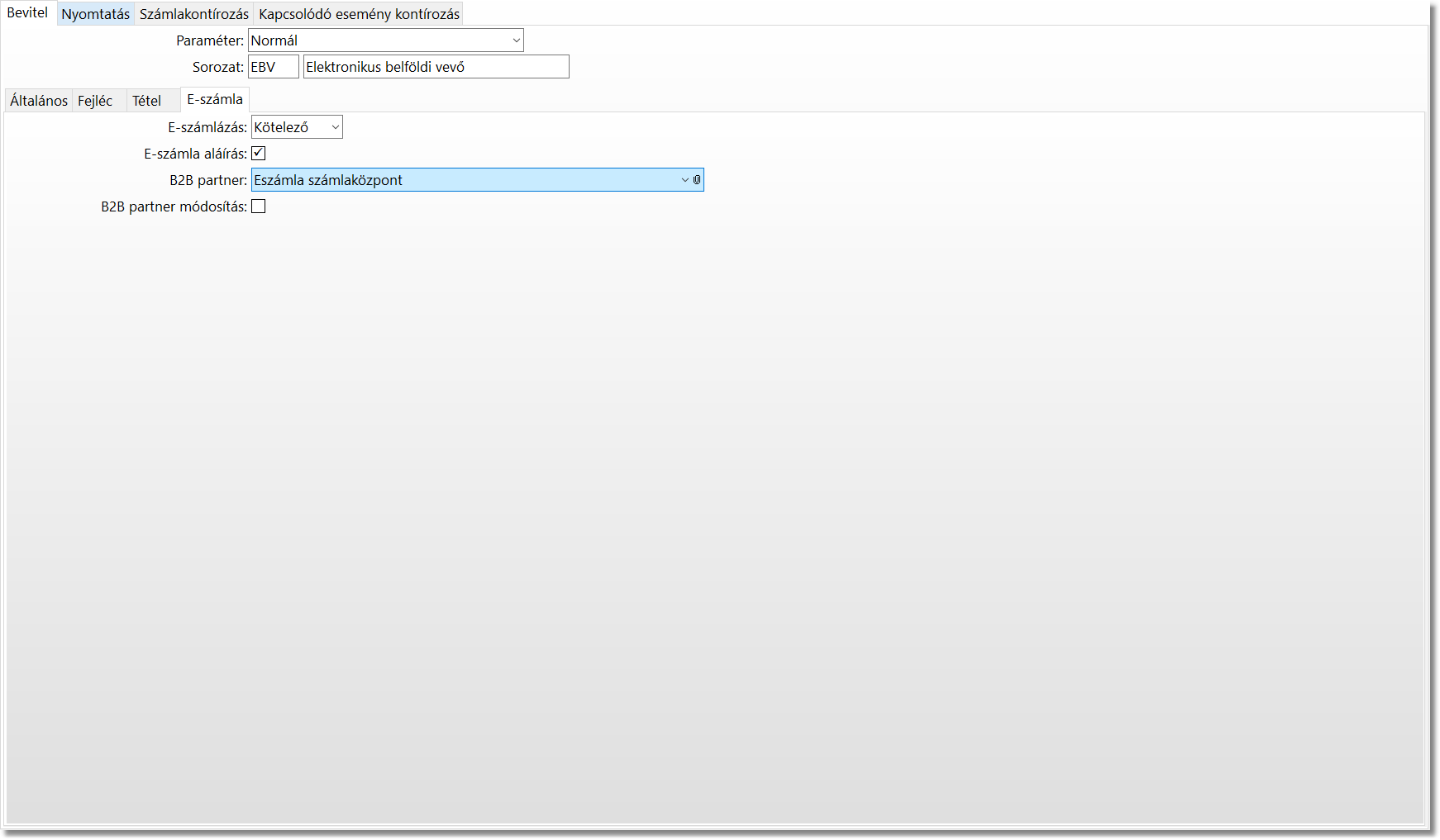 A Vevőszámla paraméter funkcióban a megfelelő sorozaton állva, be kell állítani a fent létrehozott B2B partnert, amihez a Bevitel / E-számla fülre kell lépni. E-számlázás legördülő mező legyen Kötelező, E-számla aláírás jelölőnégyzet legyen bepipálva, a B2B partnernél a korábban létrehozott partner legyen kiválasztva.