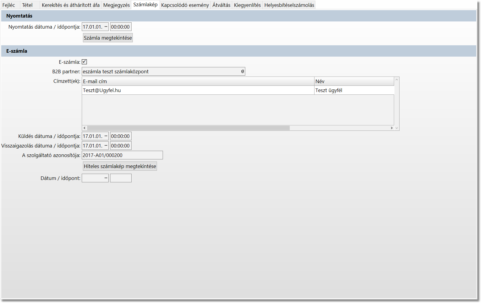 Nyomtatás után a Vevőszámla bevitelben a Számalkép fül tartalmazza a számla elküldésére és a hitelesített számla visszaérkezésére vonatkozó információkat. Továbbá lehetővé teszi az elektronikusan aláírt hiteles számla képének a megtekintését, ha a hiteles számla acrhiválását kértük. (a vevőszámla nyomtatása hagyomyános módon történik)