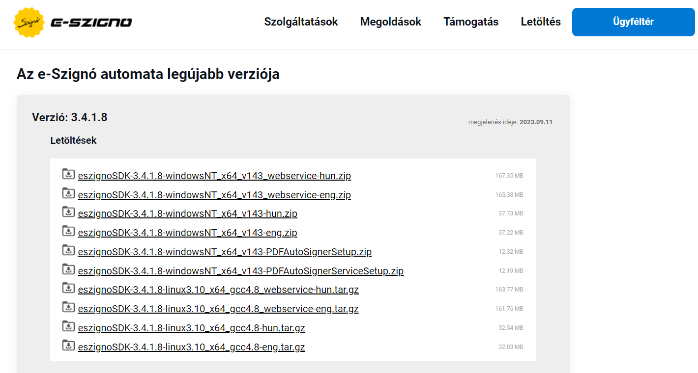 A https://srv.e-szigno.hu/ugyfelkezelo_eszigno oldalon, az Ügyféltérbe felhasználónévvel és jelszóval történő belépés után, le kell tölteni az eszignoSDK-3.4.1.8-windowsNT_x64_v143-hun.zip állományt.