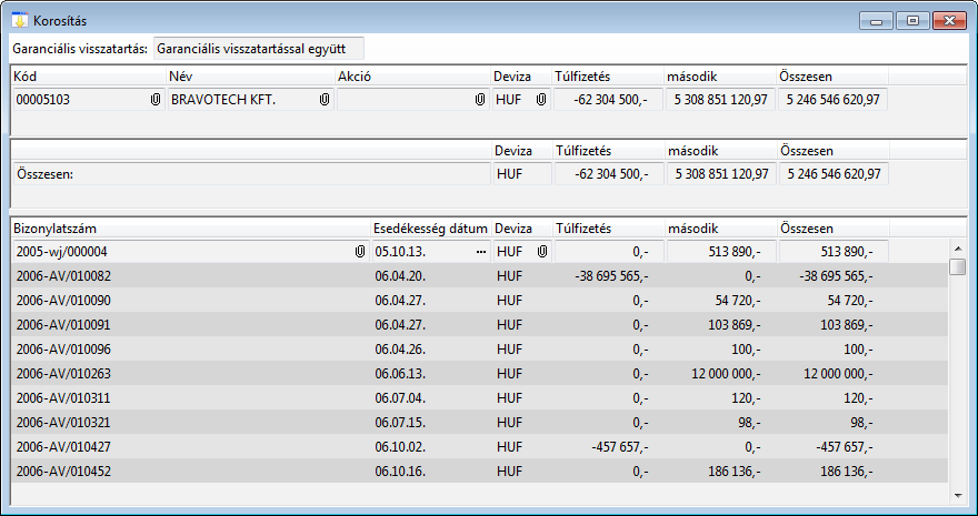 A funkció a vevő- és a szállítószámlák lejárati sávonként történő kimutatására szolgáló képernyős lekérdezés.