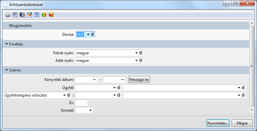 Funkció elérése menüszerkesztéskor: Vevőanalitika / Szállítóanalitika / Árfolyamkülönbözet lista