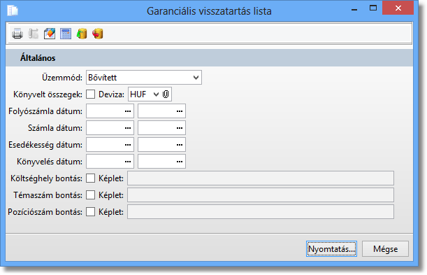 A funkció a garanciális visszatartások listázására szolgál. A lista a folyószámla tárolt eljárás eredményének tovább feldolgozásával készül. A szűrések ugyanúgy működnek itt is mint a folyószámlánál. Ha költségbontást is kérünk, akkor egy tételből több tétel keletkezik, ha a számlában több költséghely ... van.