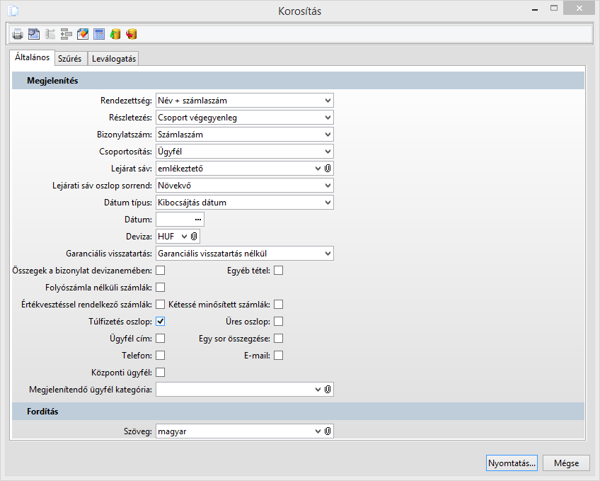 Az így kinyomtatott korosítással meg kell egyezzen az a folyószámla, amelyet úgy kapunk, hogy az Üzemmód: "Csak a ki nem egyenlített számlák", és az egyéb tételeket ... nem kérjük hozzá.