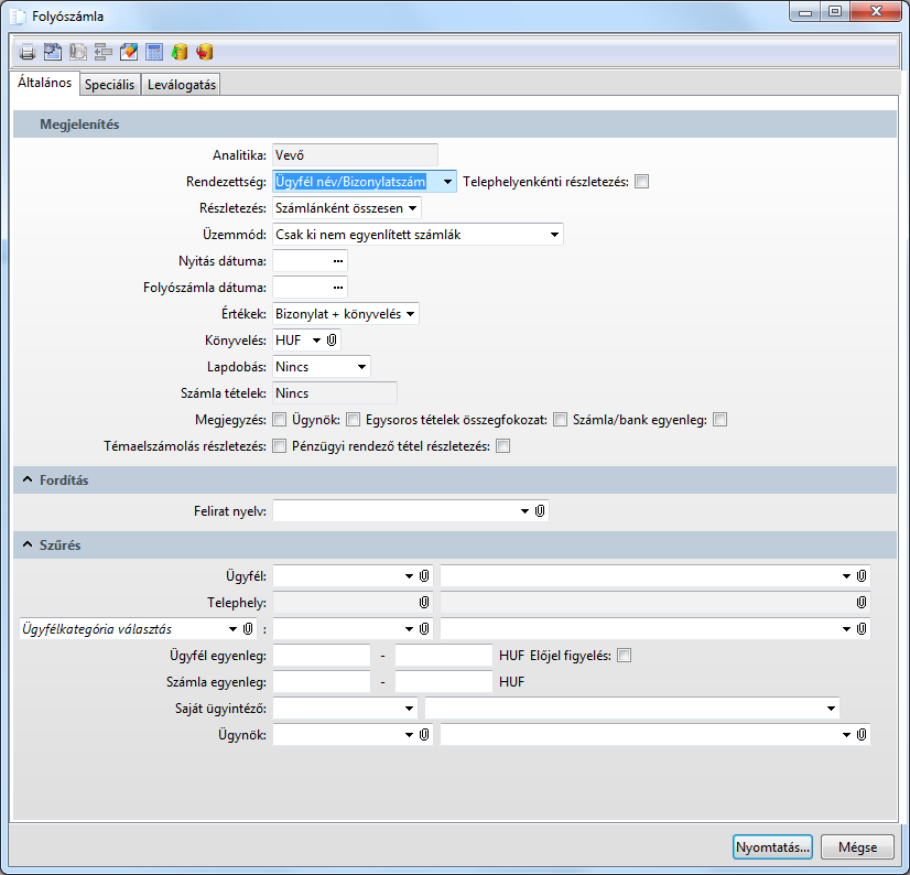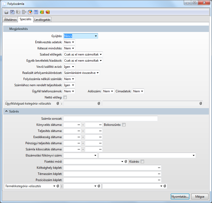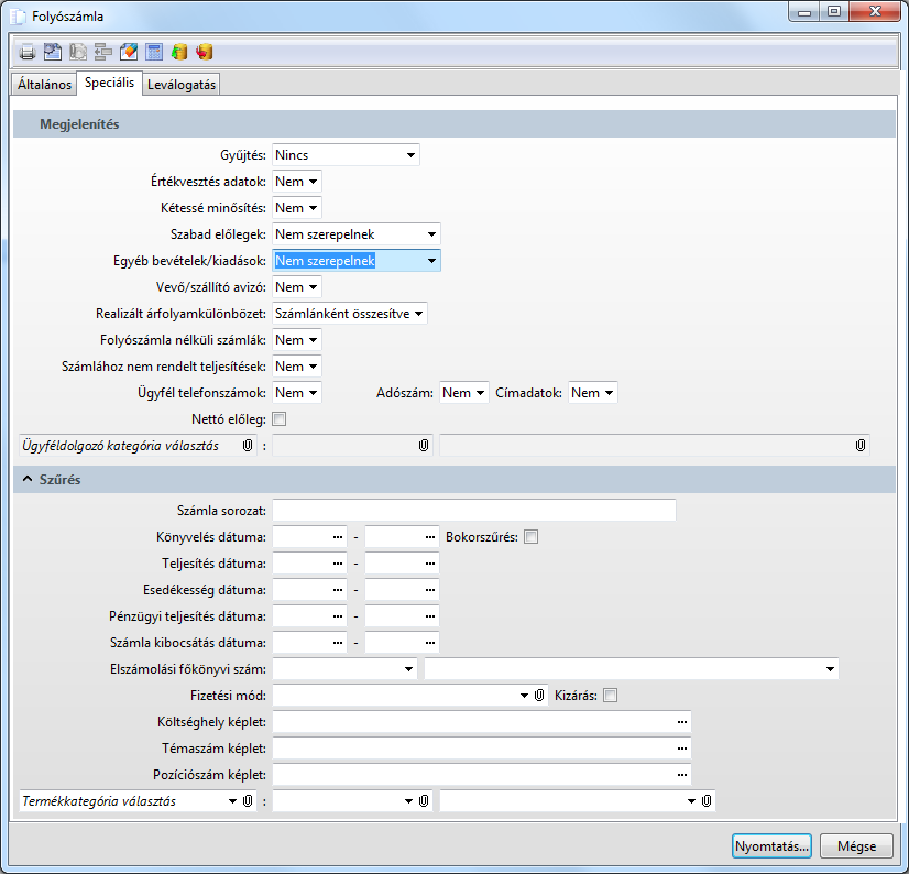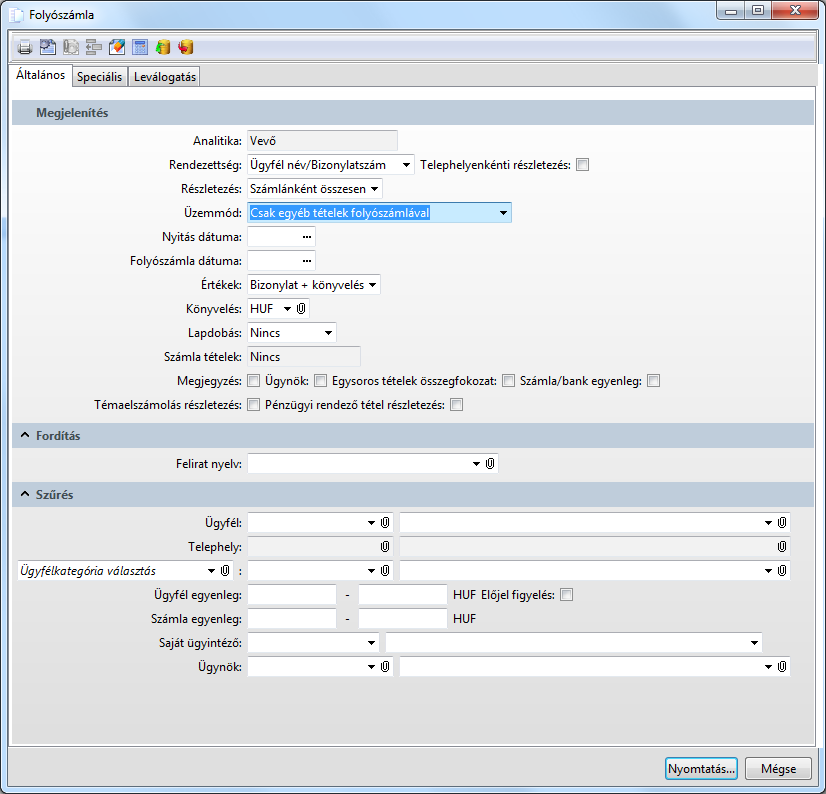 Az így kinyomtatott két folyószámla összege meg kell egyezzen a teljes folyószámlával, amelyet úgy kaphatunk meg, hogy Üzemmód: "Csak a ki nem egyenlített számlák", és a Speciális fül Megjelenítés keretben az egyéb tételeket ... kérjük a folyószámlára.