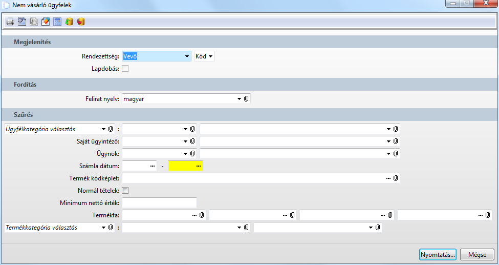 Adatforrásban is felhasználható lista. A funkció segítségével listázhatjuk, hogy kik azok a vevőink, akik egy időszakban vásároltak tőlünk és azóta nem vásároltak.