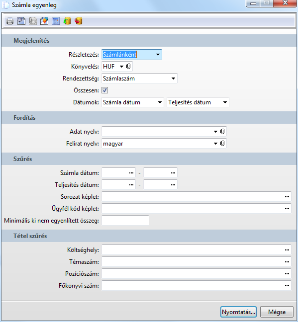 A funkció a számlák ki nem egyenlített egyenlegeit listázza költséghelyenként, témaszámonként vagy pozíciószámonként a számla devizájában és a könyvelés devizájában. A lista csak a számla tételekben szereplő költséghelyenként, témaszámonként, pozíciószámonként bontja szét a számlát, illetve a tételek alapján szűr (nem megy tovább a megosztásokig). A sztornó számlák nem jelennek meg külön sorban a listán, míg a sztornózott számlák nulla egyenleggel jelennek meg, mivel ezek kiegyenlítése a sztornó számlával történt meg.