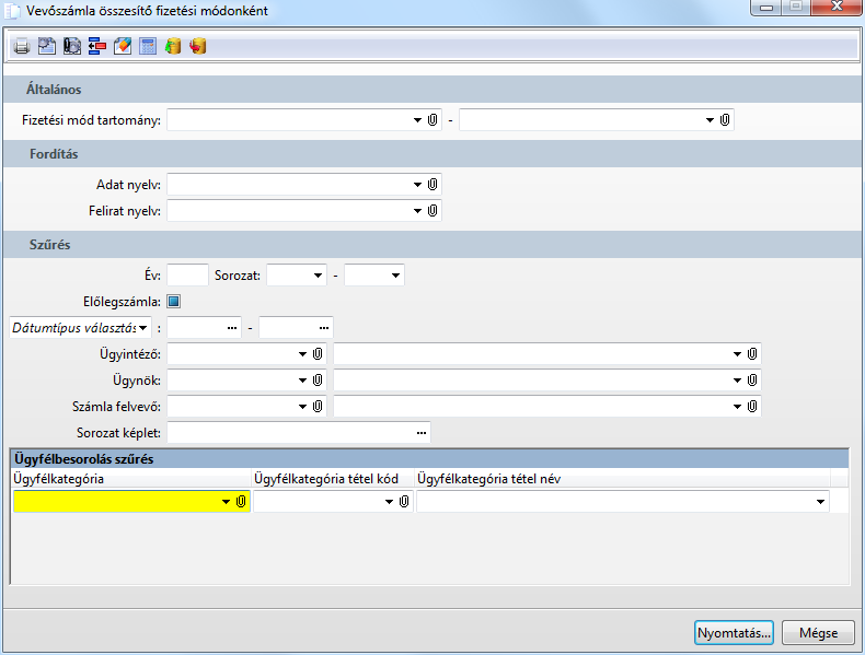 Funkció elérése menüszerkesztéskor: Vevőanalitika / Szállítóanalitika / Számla összesítő fizetési módonként lista