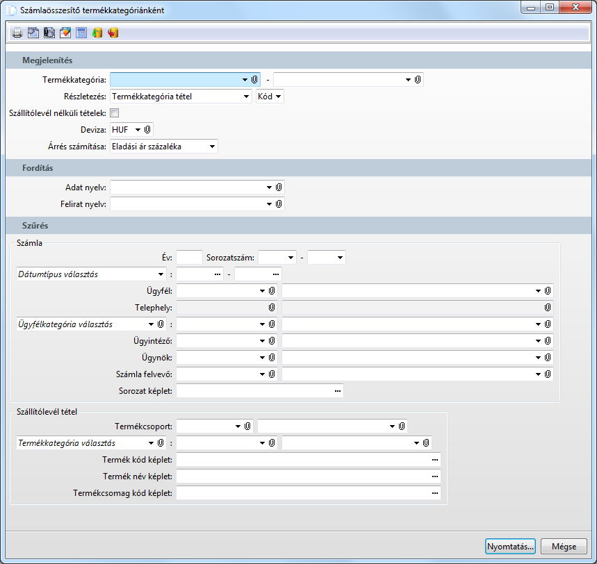 A funkció segítségével ügyfél / termékkategória / termékkategória-tételenként listázhatjuk a számláinkban szereplő tételeket.