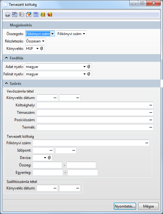 A funkcióval a vevőszámla tételben rögzített tervezett költségeket és azoknak a teljesülését, vagy nyitott egyenlegét listázhatjuk.