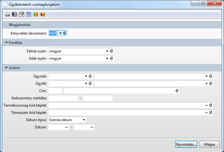 Funkció elérése menüszerkesztéskor: Vevőanalitika / Szállítóanalitika / Ügyfelenkénti csomagforgalom lista