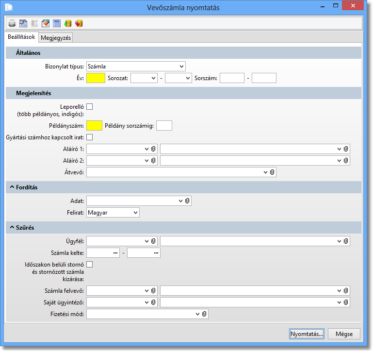 A vevőszámlák, előlegszámlák és belső számlák nyomtatására szolgáló funkció.