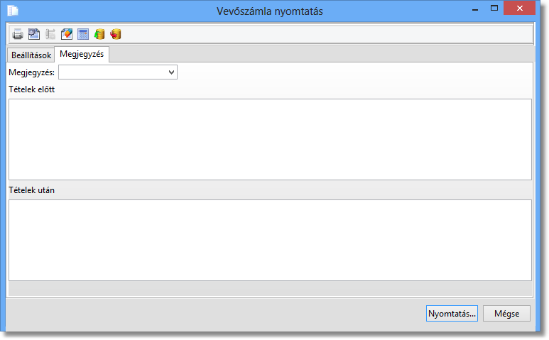 Nyomtatáskor a bevitelben - a bizonylat elé, vagy után beállított - bizonylatmegjegyzésként megadott megjegyzésszöveg összefűzésre kerül a számlasorozathoz tartozó paraméterhez megadott felső illetve alsó megjegyzésszöveggel, azaz amennyiben a tételek után nyomtatandó bizonylatmegjegyzés utolsó sora után nem nyomunk egy 'Enter' billentyűt, akkor egybefüggő szövegként fog megjelenni a paraméterhez megadott alsó megjegyzéssel!