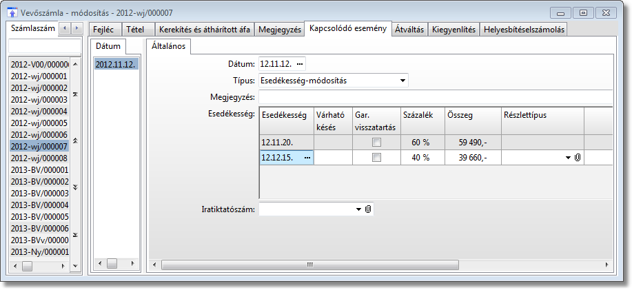 A kiegyenlítetlen vevőszámlákra fizetési felszólítások, késedelmi kamatközlő levelek küldhetők, amelyek nyilvántartásra kerülnek. A számlán vezethető és nyomon követhető az esedékesség módosítás és a kétessé minősítés is.