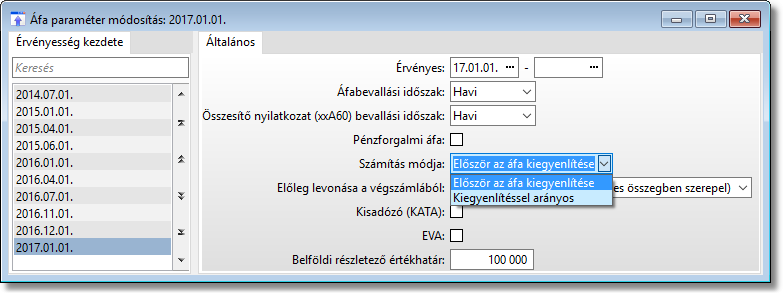 Az Áfa paraméter funkcióban lehet beállítani, hogy a saját vállaltunk pénzforgalmi áfás, vagy sem. Minden változáskor érdemes a régi érvényes időszakot lezárni, és újat felvenni a változással. A másik megadható változó a számítás módja, melynek két értéke van, az először az áfa kiegyenlítés az első, ami a valós befolyt összegből először az áfa értékét tölti ki, majd ha már megvan akkor könyvelődik a vevőszámlán megadott főkönyvi számra. A második a Kiegyenlítéssel arányos érték, ami ahogy a neve is tükrözi arányosan egyenlíti ki az áfát és a nettó értéket.