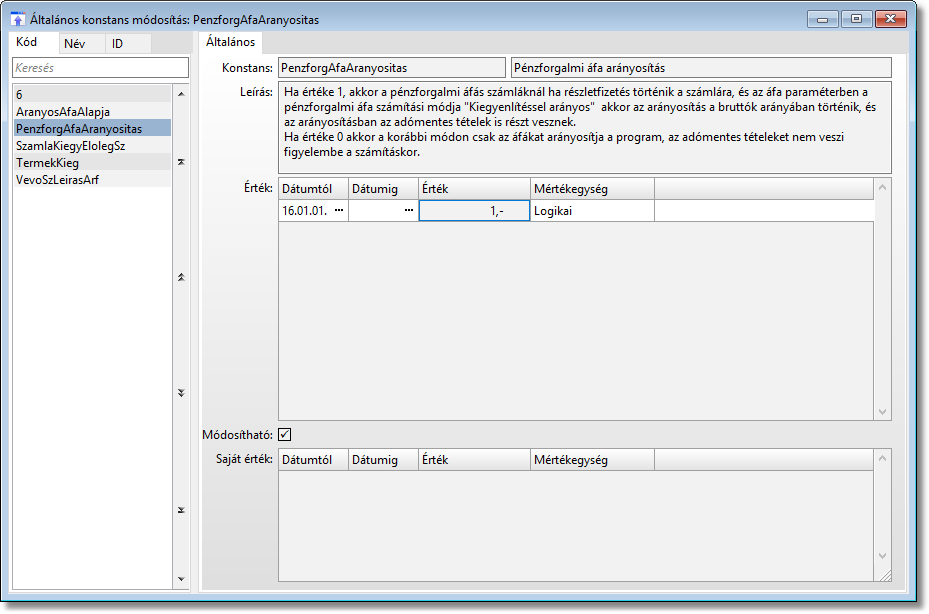 Az Általános konstans funkcióban pedig azt lehet megadni, hogy a pénzforgalmi áfa arányosítása hogyan történjen, azaz amikor az érték táblázatban az érték mező értéke 1 akkor a pénzforgalmi áfás számláknál a részletfizetés esetén, és az előbb taglalt áfa paraméter funkcióban a Kiegyenlítéssel arányos értéket adtuk meg, akkor az arányosítás a bruttó értékek arányában történik és az adómentes tételek is részt vesznek az arányosításban. Amikor az érték 0, akkor csak az áfát arányosítja a program, és az adómentes tételek nem vesznek részt az arányosításban.