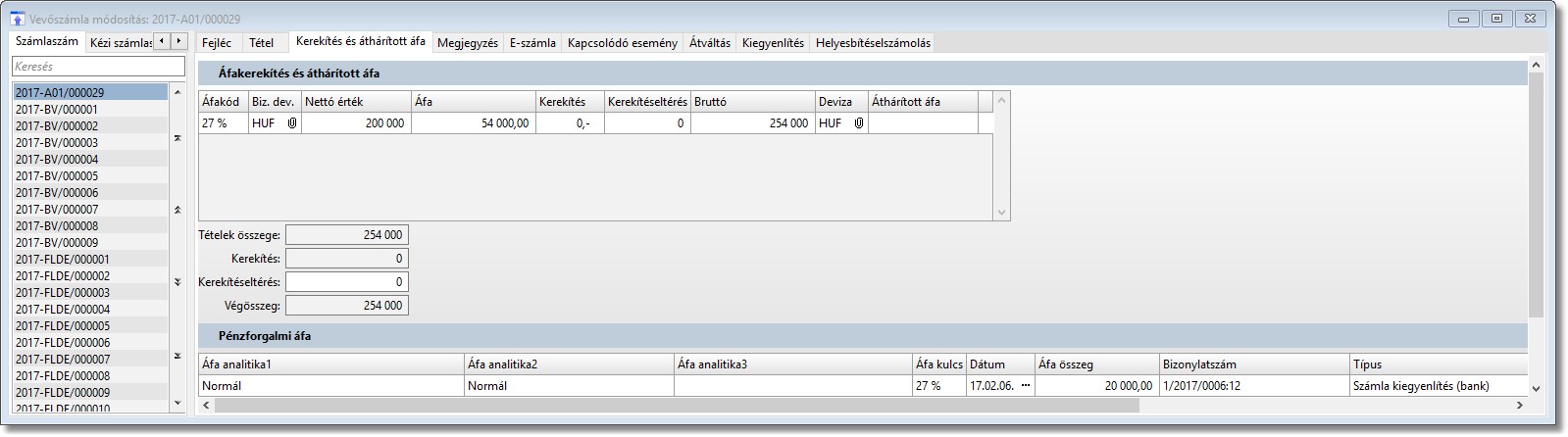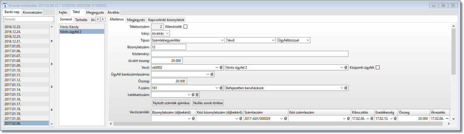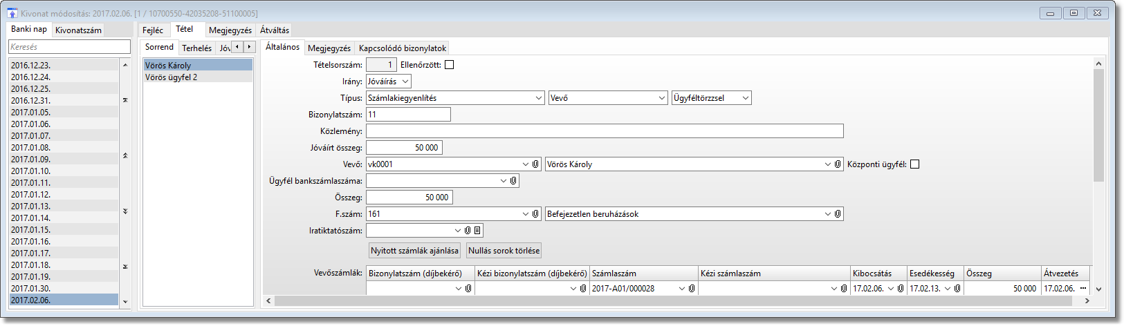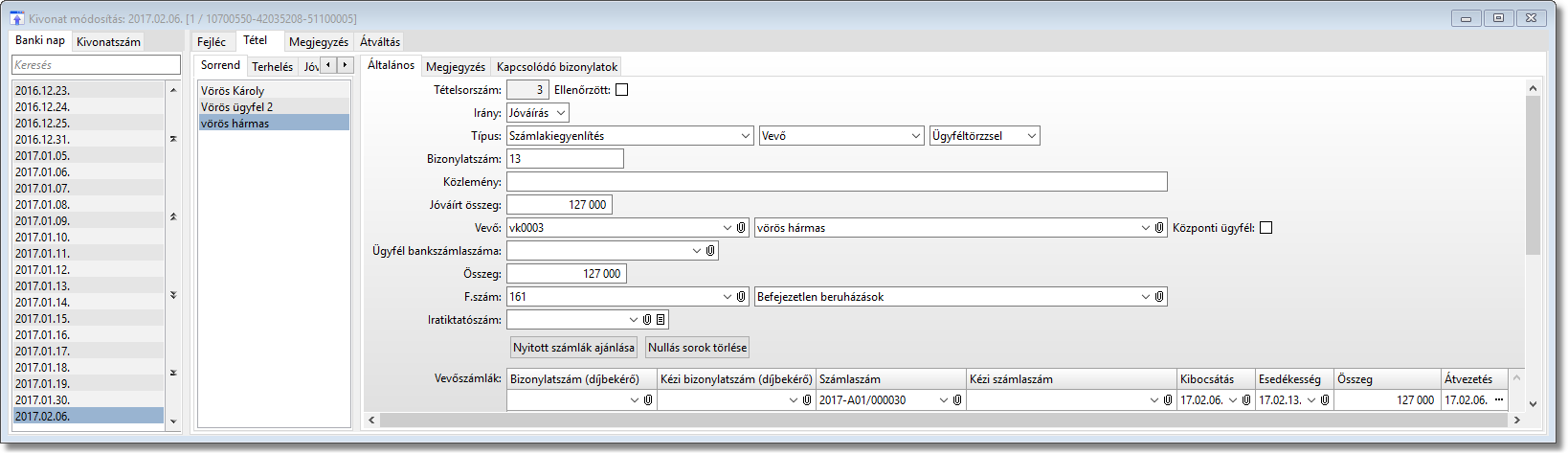 A harmadik példában az áfa paraméterben a kiegyenlítéssel arányos értékkel vesszük fel a vevőszámlát és a bankkivonatot.