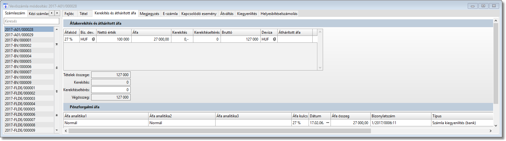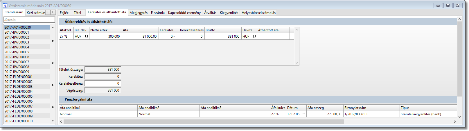 Ebben a példában a vevőszámlám nettó értéke 300 000 forint az áfa értéke 81 000 forint a bruttó érték így 381 000 forint. A kivonaton 127 000 forintot egyenlítettem ki, ami azt jelenti, hogy 1/3-ad részét a vevőszámlának. Így a nettó összegből 100 000 forint míg az áfából 27 000 forint egyenlítődött ki.