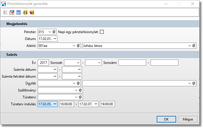 Egy sofőr egyszerre több túraterv kapcsán történő elszámoltatási lehetősége. Pénztárbizonylat generálás túraterv indulási intervallum alapján, adott sofőrre (Aláíró).
