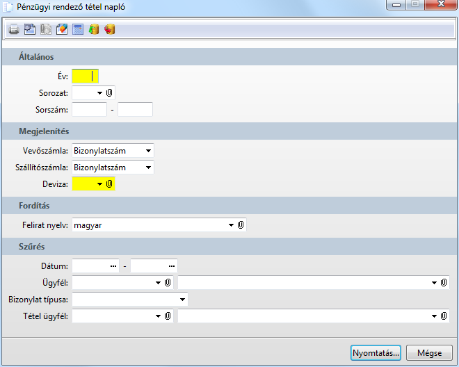 Funkció elérése menüszerkesztéskor: Vevőanalitika / Szállítóanalitika / Pénzügyi rendező tétel napló