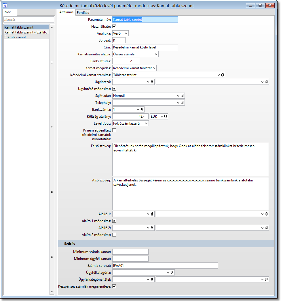 A különböző szituációkban – a cég tartozáskezelési stratégiájának megfelelőn – küldendő késedelmi kamatterhelő levelek tulajdonságai (pl.: minden számlára kell számolni, vagy csak a kiegyenlítettekre) rögzíthetők a funkció segítségével. A szűrés dobozban megadható számlára vonatkozó összegek alapdevizanemben kerülnek megadásra. Nem alapdevizás számlák vizsgálatakor az alapdevizára átváltott számlaösszeg kerül összehasonlításra a jelen funkcióbeli számlaösszeg jellegű mezők értékével.